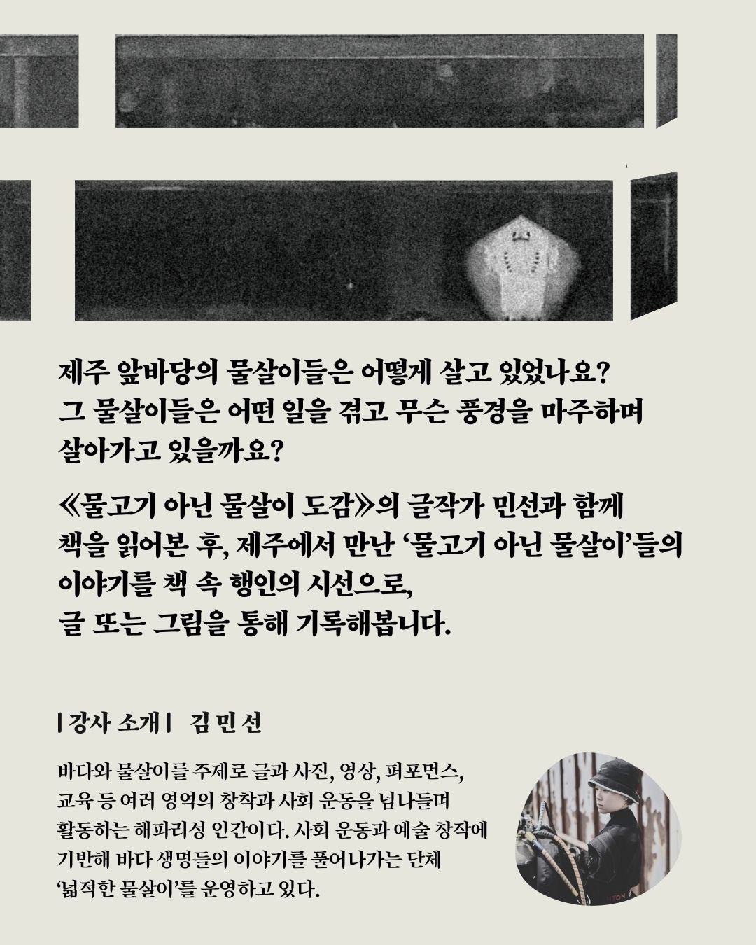 <물고기 아닌 물살이 도감>을 글작가 민선과 함께 읽어본 후, 제주에서 만난 ‘물고기 아닌 물살이’들의 이야기를 책 속 행인의 시선으로 글 또는 그림을 통해 기록해봅니다.