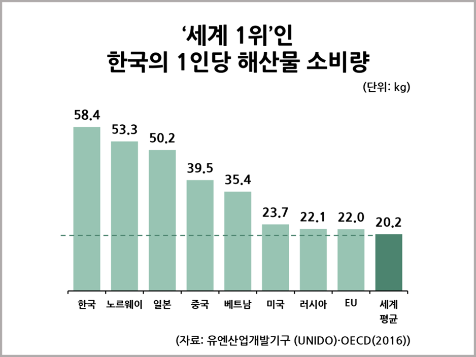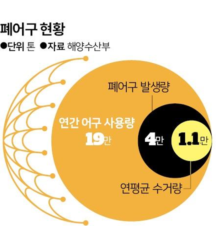 한국의 1인당 해산물 소비량(좌), 폐어구 현황과 연평균 수거량(우)