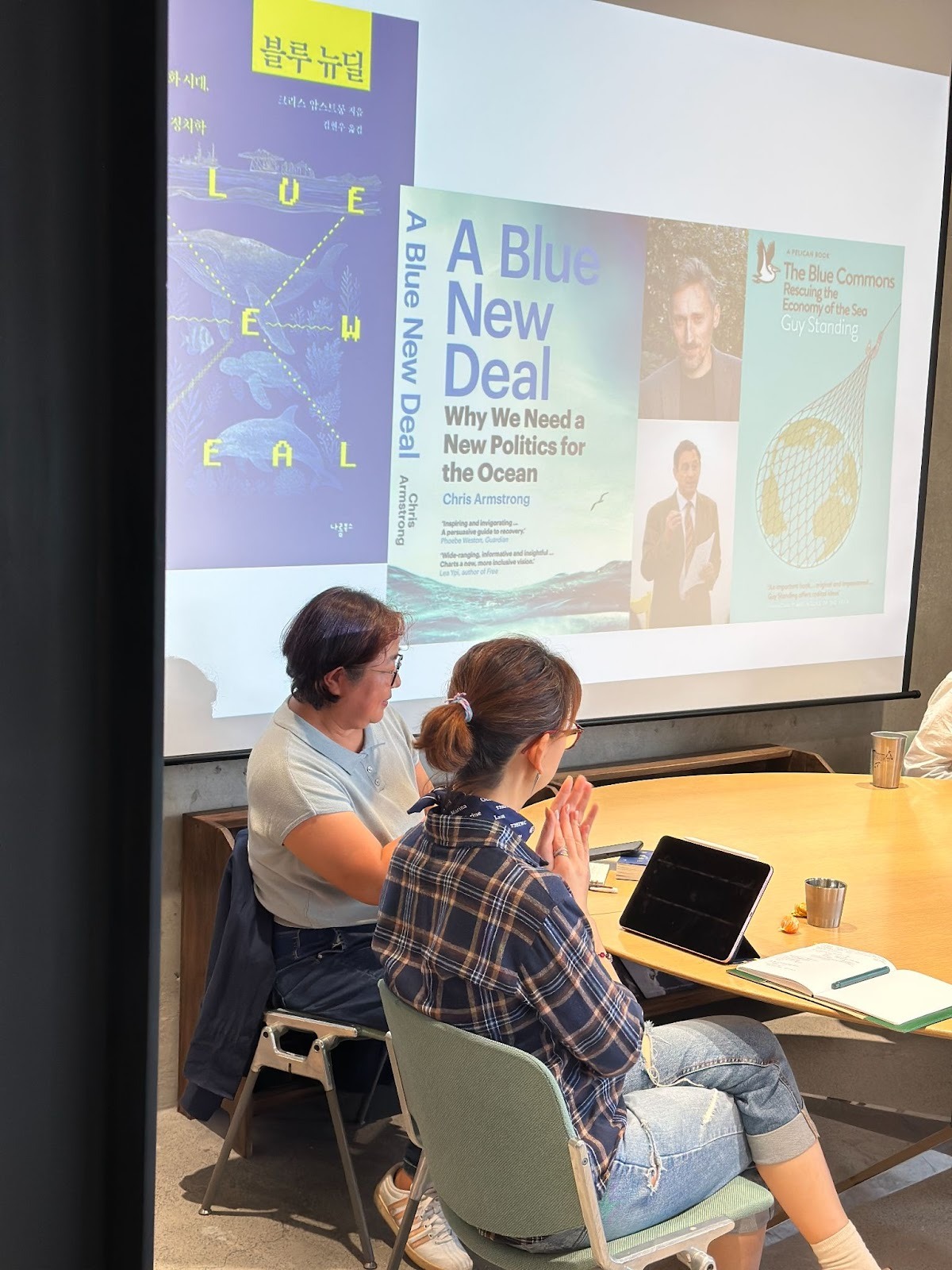 <블루 뉴딜> 북토크의 참가자들은 크리스 암스트롱의 제안에 따라, 바다를 단순히 자원 창고가 아닌 정치적 공간으로 바라보는 시각을, 기후위기와 해양 위기를 연결해 바라보는 정치적 상상력을 이야기 나눴습니다. ‘자유 이용의 원칙’은 바다의, 바다에 의한, 바다를 위한 원칙으로 적절한지 토론했고, ‘공동 유산의 원칙’으로 정의로운 해양 거버넌스를 새롭게 재편할 수 있을지 상상했습니다. 나아가, 우리가 살고 있는 이 공간인 제주 바다의 인클로저는 어떻게 작동하고 변화할지도요.