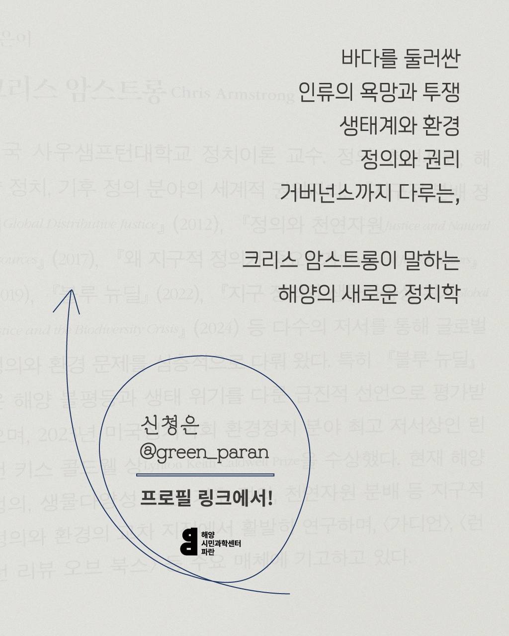 <블루 뉴딜>의 저자인 크리스 암스트롱은 영국 사우샘프턴대학교 정치이론 교수입니다. 해양학자, 생물학자가 기존의 해양 관련 도서를 주로 썼다면, <블루 뉴딜>은 해양이라는 공간에서 벌어지는 불평등, 자원 독점, 오염과 파괴, 노동 착취 등의 문제를 정의의 관점에서 재조명합니다. 이 책은 단순한 해양 환경서가 아니라, 해양을 둘러싼 정치, 경제, 법, 생태의 복합적 문제를 종합적으로 분석한 정치 이론서로 평가받고 있습니다. 이 책을 번역한 김현우 소장은 크리스 암스트롱처럼, 해양에서 벌어지는 기후위기와 불평등의 정치에 관심이 깊습니다. 나아가, 정의로운 에너지 전환을 연구하는 이론가이며 탈성장과 기후정의를 외치는 행동하는 활동가입니다.