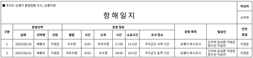 정준은 새로운 루트와 이전까지 조사했던 루트의 전체 길이는 거의 같은데, 조사 시간은 훨씬 덜 걸렸고, 기름도 훨씬 덜 썼다고 했다. 수진은 ‘다른 연구자들이 조사 루트가 잘 그려지면 그런 현상이 종종 일어난다고들 하는데, 이번에 그렇게 된 거 같다!’ 라며 서로 신기해했다. 자! 이제 최적의 루트도 셋팅이 되었고! 상괭이와의 다음 만남이 언제나 되려나 기대중!!