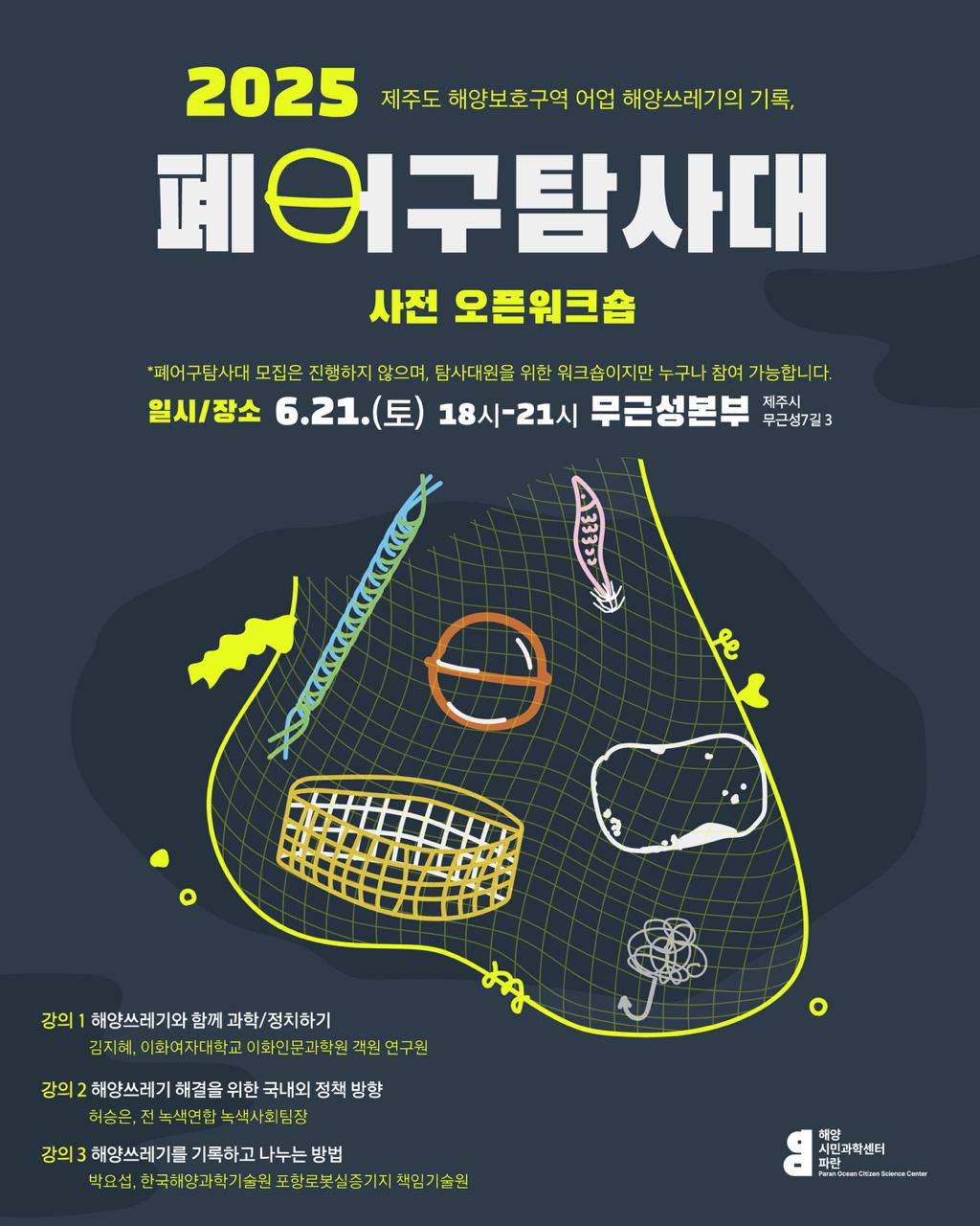 5월부터 준비한 파란의 '폐어구탐사대'는 기획단 5명과 현장 조사에 함께하는 멤버들이 활동 중입니다. 6월 사전 교육 워크숍에서는 김지혜 연구원(카이스트 인류세연구센터)의 <해양쓰레기와 함께 과학/정치하기>, 허승은(전 녹색연합 녹색사회팀) 팀장의 <해양쓰레기 해결을 위한 국내외 정책 방향>, 박요섭 책임기술원(한국해양과학기술원 포항롯봇실증기지)의 <해양쓰레기를 기록하고 나누는 방법>에 대한 발표자료를 듣고, 논의하는 시간을 가졌습니다.
