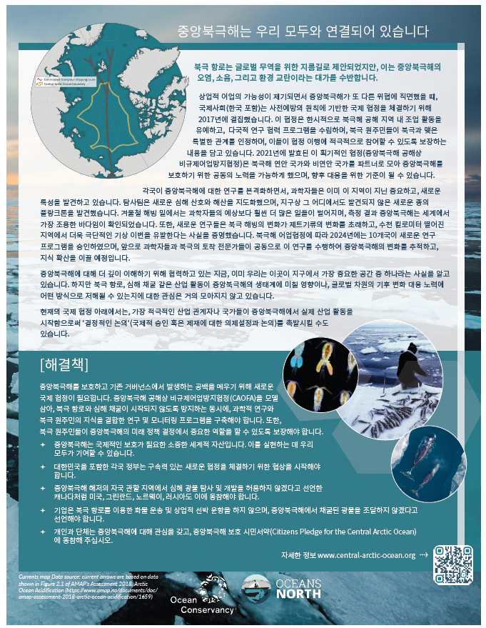 지난 4월말, 한국에서 개최된 국제해양회의 아워오션컨퍼런스 Our Ocean Conference 기간 중, 위 단체들과 함께한 사이드이벤트에서 사용한 '중앙북극해 보호의 필요성' 브로셔를 참고해주세요.