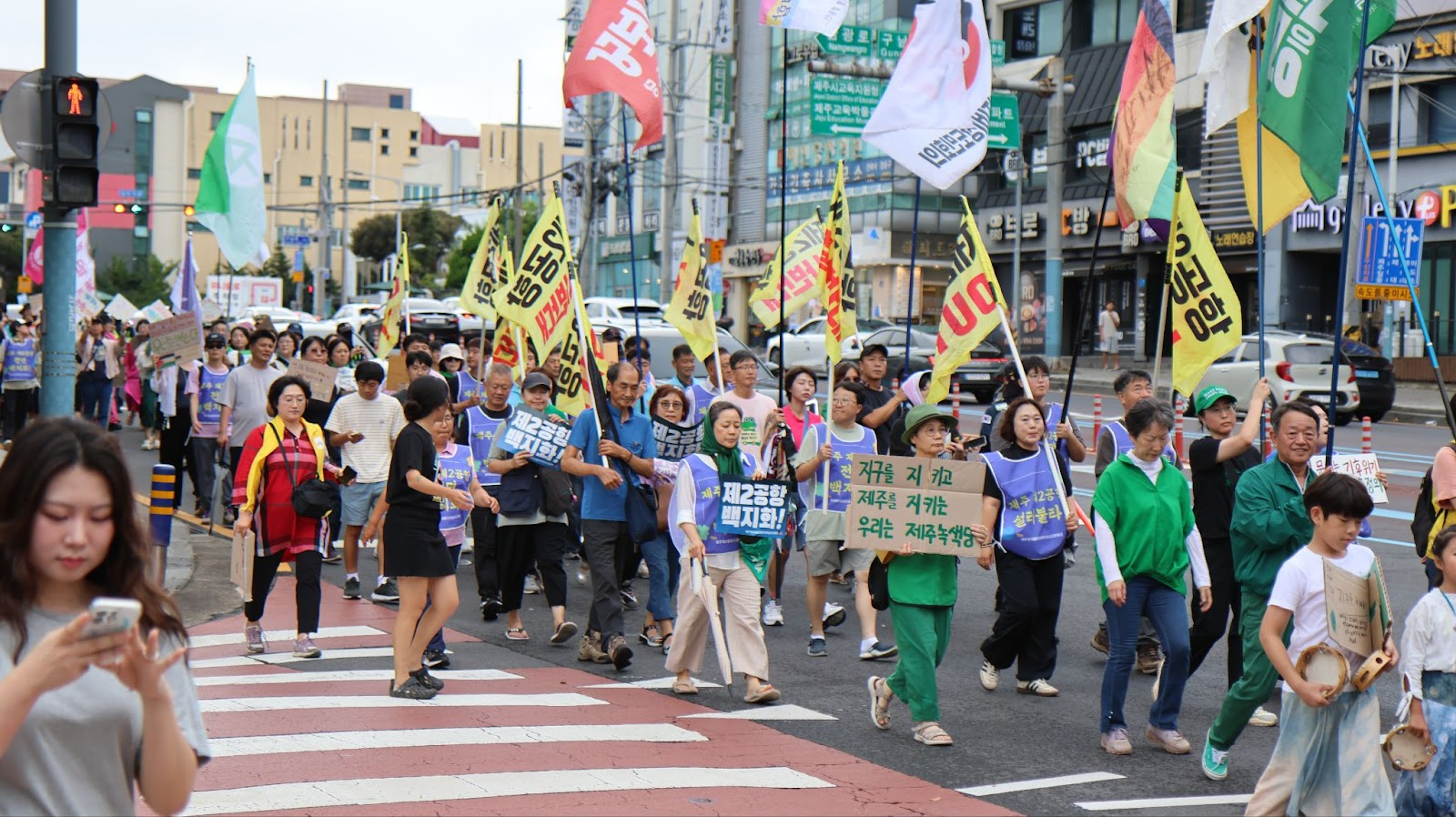9월 27일, 기후위기의 최전선인 제주에서도 우리는 모였습니다. 이상기후로 아침부터 변덕스러운 날씨에도 250여 명의 시민들이 제주 시청 일대에 모여서 “기후정의로 되찾는 제주, 다시 살아나는 섬”을 힘차게 외쳤습니다. 끓어오르는 제주 바다와 기후 재난으로 고통받는 농민과 노동자의 현실을 짚으며, 전국 기후정의행진 6대 요구안에 더해 제주 지역의 시급한 과제들을 요구했습니다. 특히, 제주 제2공항 건설 백지화와 가스발전소 신규 건설 중단, 그리고 지하수 증산 불허 등 대규모 개발 사업의 중단을 촉구하는 목소리가 이어졌습니다. 여전히 성장 논리에 기대어 진행되는 불필요한 토건 개발이 제주의 생태계와 생명수를 파괴하고 있음을 강력히 비판했습니다. 기후재난의 근본적인 해결은 '삶의 방식을 바꾸는 거대한 움직임'에서 시작됨을 강조하며, 기후재난의 시대를 끝내고 평화와 생명이 꿈틀대는 제주도를 되찾자는 목소리에 모두가 공감하고 함께했습니다.