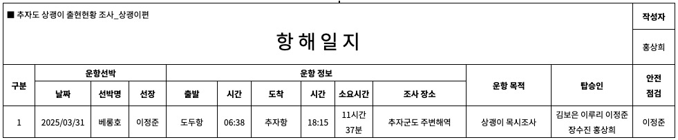 “3월 마지막 날, 이렇게 조사에 나설 수 있어서 다행입니다. 오늘도 안전한 조사가 되길 바라며, 상괭이 편, 파이팅.”
