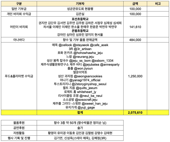푸드&플리마켓 셀러분들의 기부금을 모아 파란에 전해주셨습니다. 개인후원 및 아나바다 마켓을 통해 판매한 수익금까지 2일간 마켓을 통해 기부된 금액은 총 2,075,610원 입니다. 참 감사합니다. 마켓의 제목처럼, 바다를 살리는데 고스란히 사용하겠습니다.
