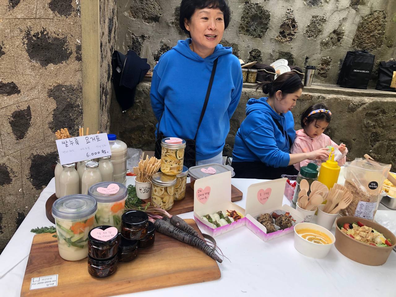 귤 주스와 당근주스, 전복죽과 칼국수, 차와 분식, 파스타와 샐러드, 돈카츠와 브로콜리까지 제주의 음식과 맛있는 디저트도 가득한 푸드마켓도 성황입니다. 맛있는 밥으로 이 모든 일을 도모하게 했다는 김기연 회원님도 푸드마켓의 셀러로 나섰습니다. 김페스토가 올라간 감태 주먹밥, 톳주먹밥과 고추장아찌, 냉파스타 샐러드와 단호박 스프, 쌀누룩 요거트까지...아! 다시 먹고싶은 맛이었어요!