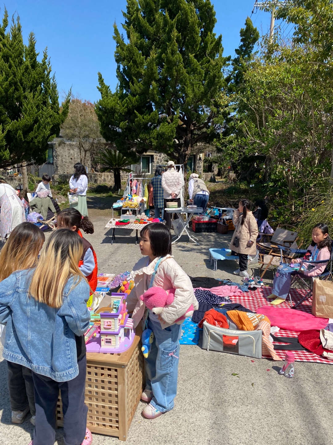 주차장에서 들어서면 아나바다 마켓을 열고 있는 어린이들이 맞이합니다. 온평초등학교와 표선초등학교 아이들입니다.