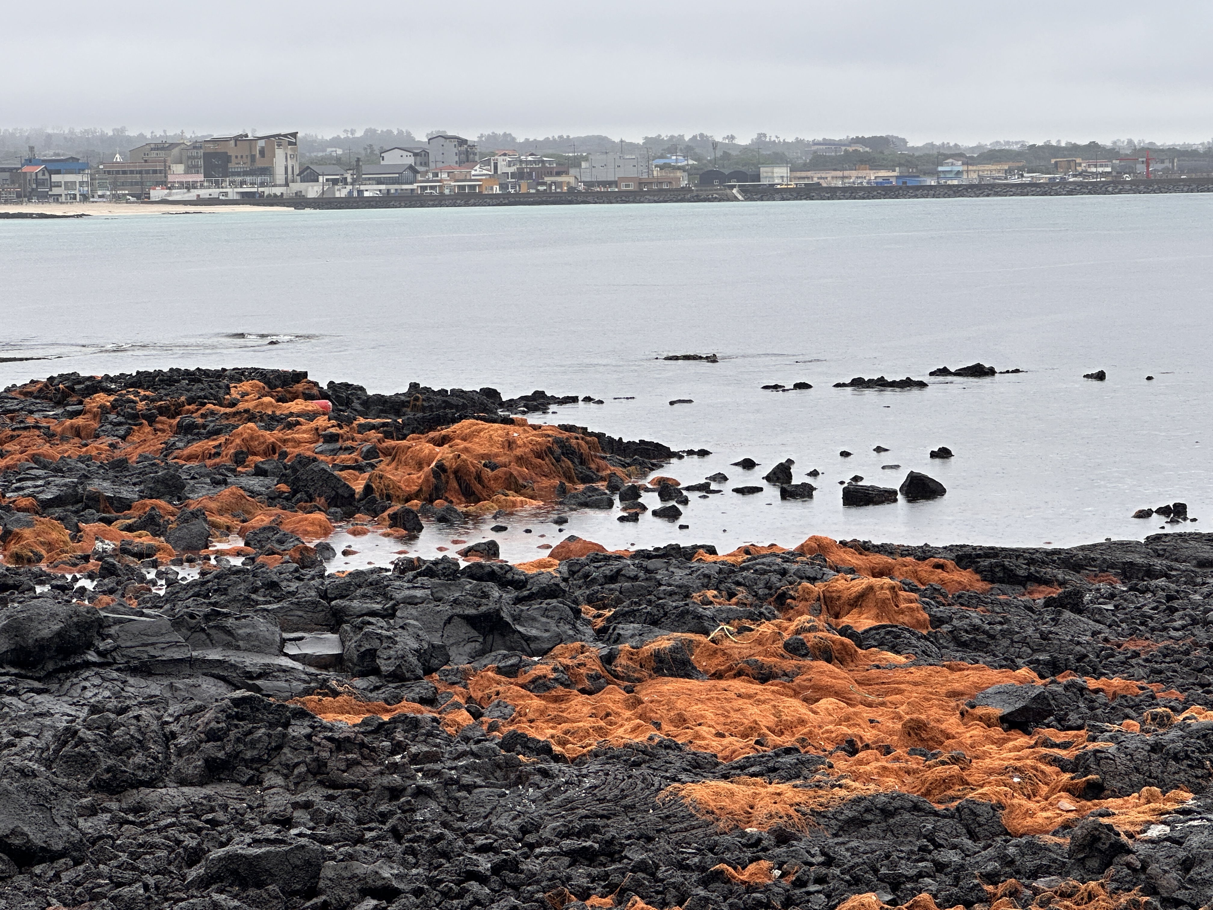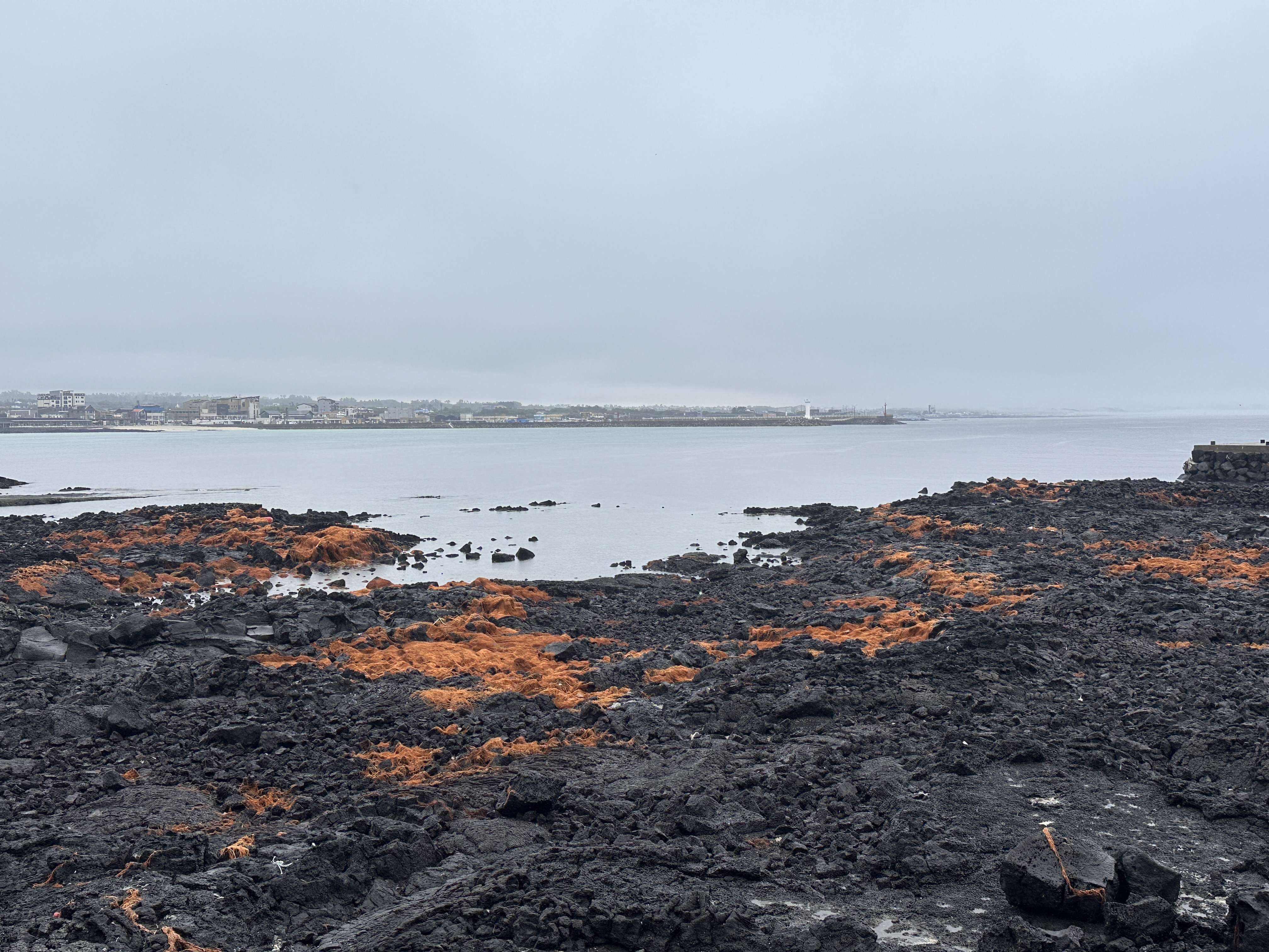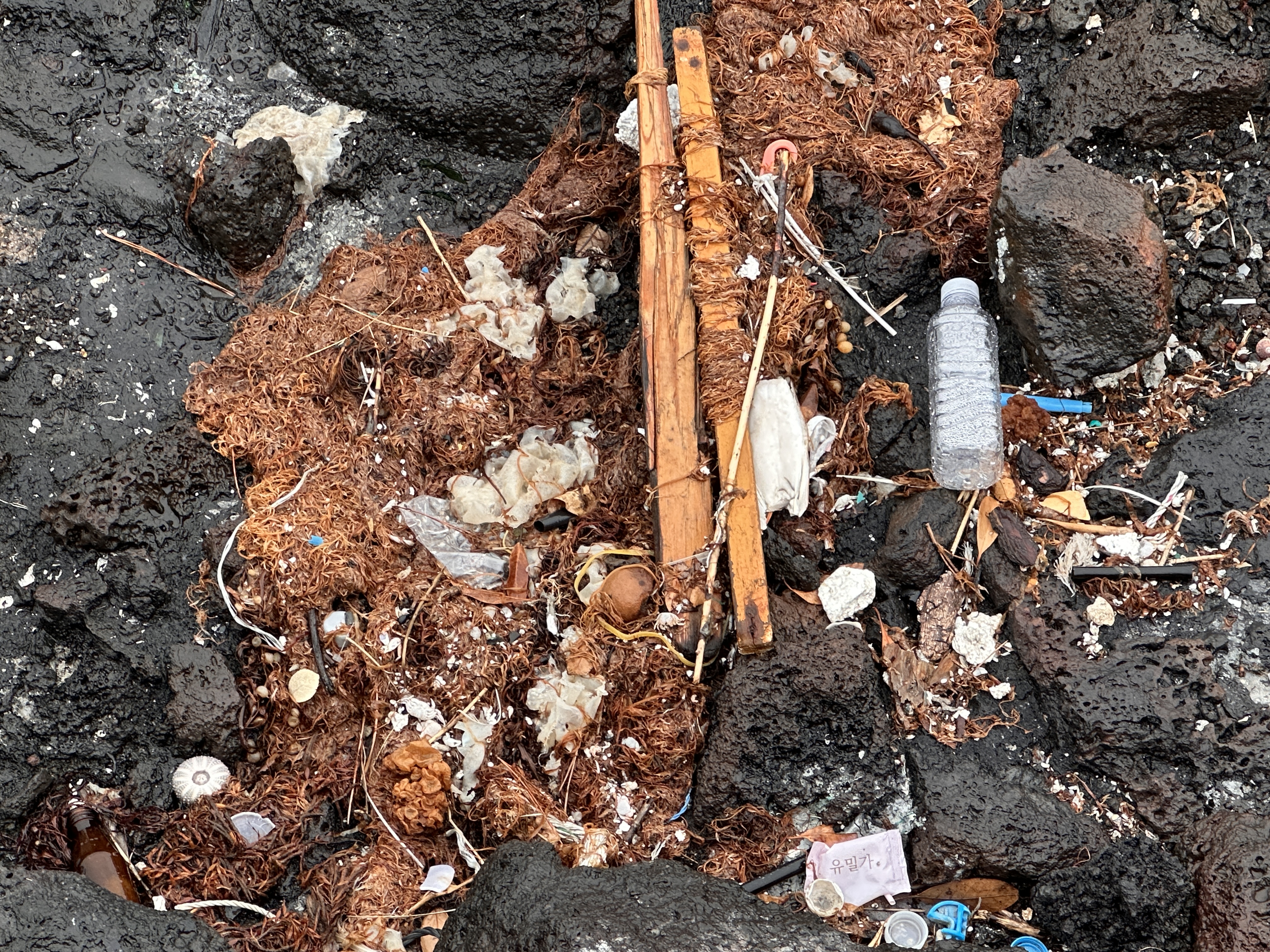 다음은 세화 해수욕장 인근을 차로 둘러보았다. 차를 대기 힘들고 비가 내려 조사에 불편함이 있었다. 세화해수욕장에 구멍갈파래는 쌓여있지 않았다. 그러나 이곳으로 오는 길의 해안가는 돌이 많은 지형이었는데, 무언가 붉은 것들로 뒤덮여 있어 차를 세우고 자세히 보았다. 정체는 바로 괭생이모자반이었다, 괭생이모자반도 해안으로 많이 밀려오는 골칫덩이 중 하나이다. 중국에서부터 엄청난 양이 밀려온다고 한다. 중간중간 쓰레기가 많이 섞여 있었다. 다음 장소로 가기 위해 해안로로 이동하는 동안에도 괭생이모자반이 계속 눈에 띄었다.