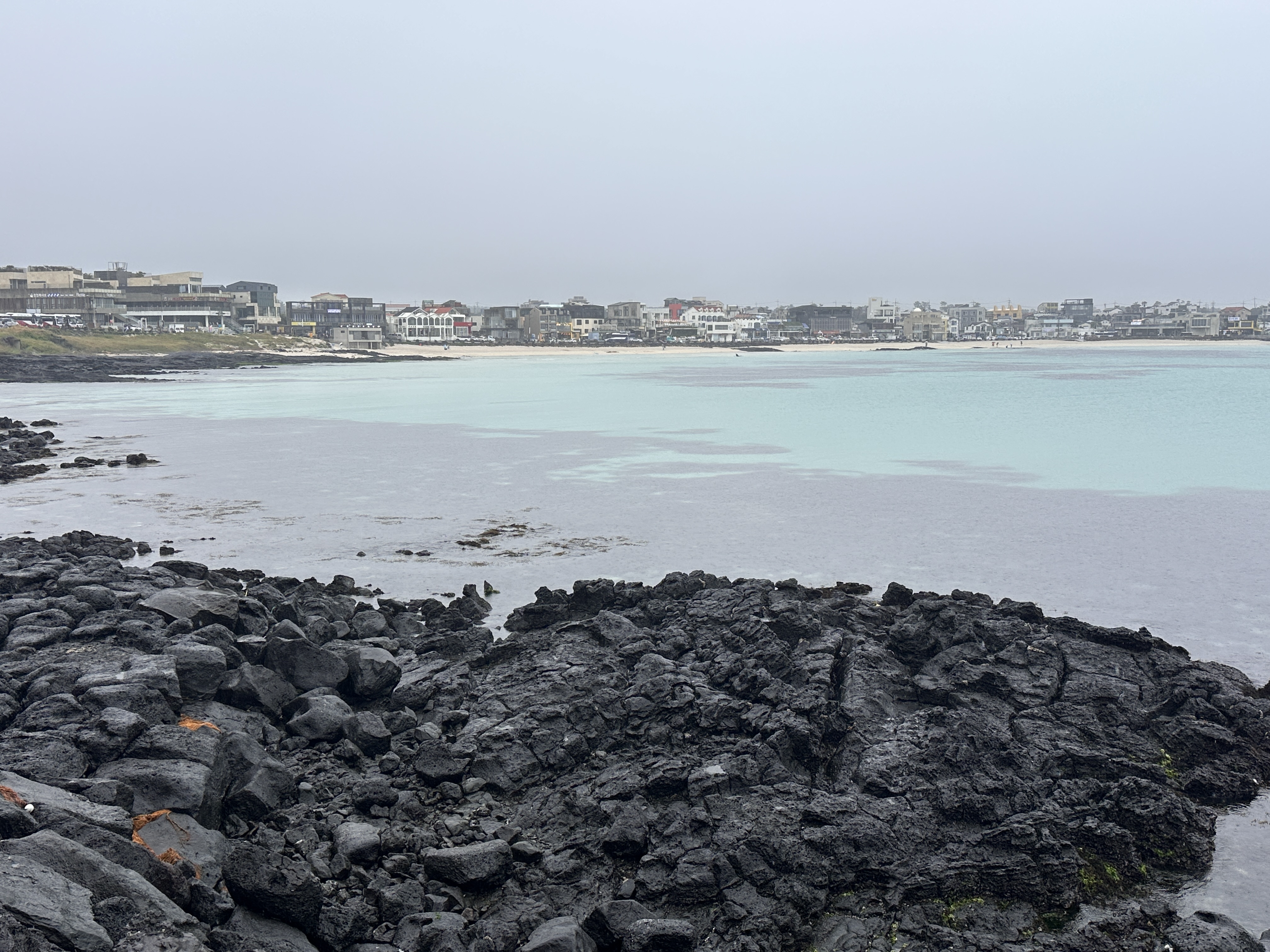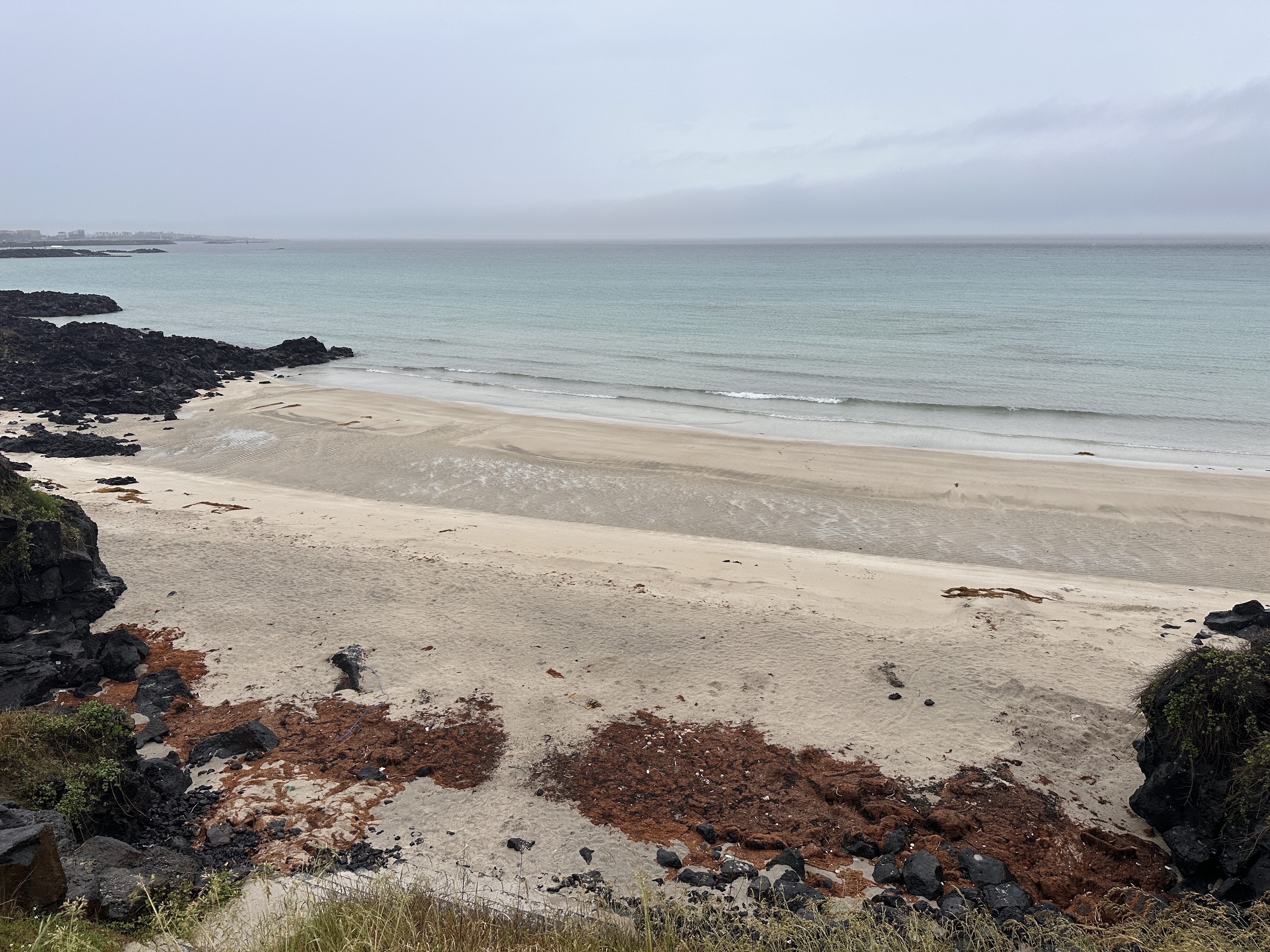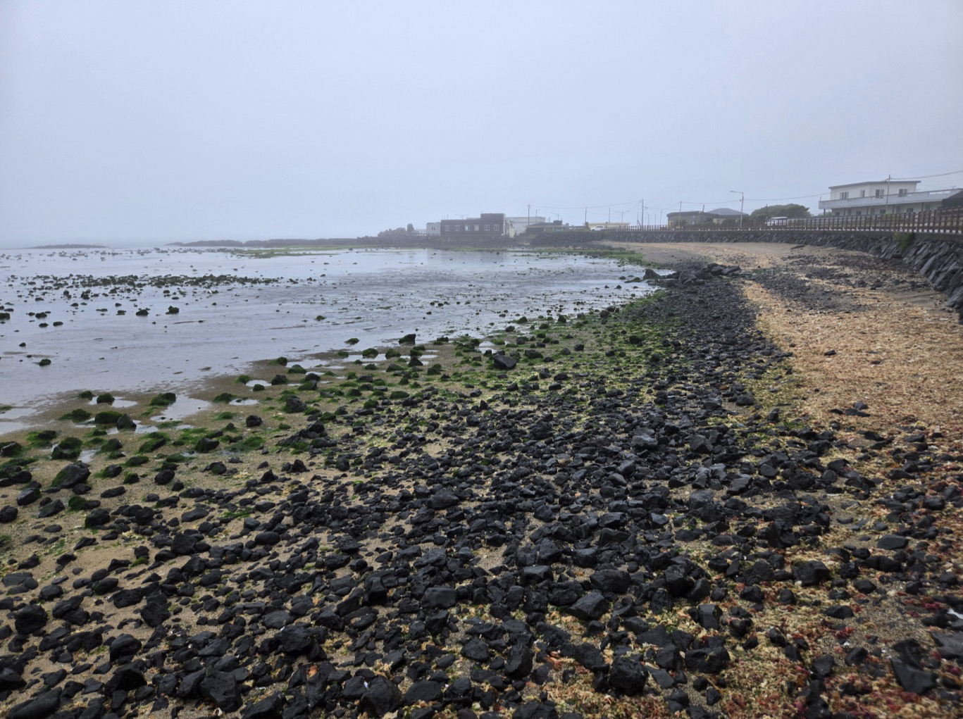 다음은 세화 해수욕장 인근을 차로 둘러보았다. 차를 대기 힘들고 비가 내려 조사에 불편함이 있었다. 세화해수욕장에 구멍갈파래는 쌓여있지 않았다. 그러나 이곳으로 오는 길의 해안가는 돌이 많은 지형이었는데, 무언가 붉은 것들로 뒤덮여 있어 차를 세우고 자세히 보았다. 정체는 바로 괭생이모자반이었다, 괭생이모자반도 해안으로 많이 밀려오는 골칫덩이 중 하나이다. 중국에서부터 엄청난 양이 밀려온다고 한다. 중간중간 쓰레기가 많이 섞여 있었다. 다음 장소로 가기 위해 해안로로 이동하는 동안에도 괭생이모자반이 계속 눈에 띄었다.