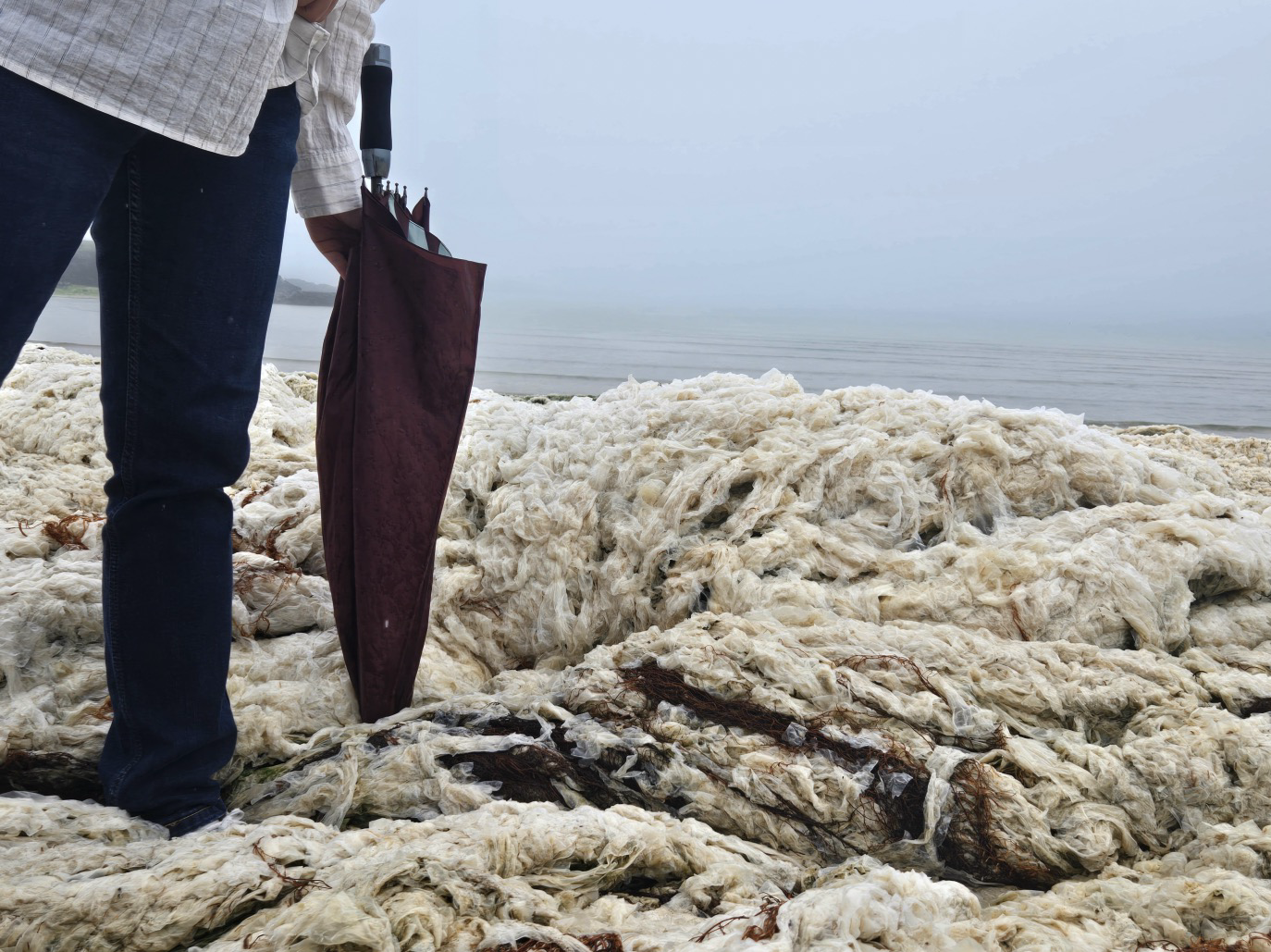 추적추적 내리는 비를 맞아 더욱 미끌미끌해진 구멍갈파래는 허벅지 정도의 높이까지 가득 쌓여있었다. 못지않게 중간중간 쓰레기도 많이 섞여 있었다. 해변 안쪽으로 들어가 막 밀려온 구멍갈파래를 가까이서 보고 싶었다. 하지만 높이 쌓인 파래들을 밟으니 미끄러져 구멍갈파래를 뒤집어서 쓸 것만 같았다. 멀리서 눈과 사진으로 담는 것에 만족하기로 했다. 사실 예전 조사 사진 만큼은 심하지 않을 것으로 생각했는데, 해변을 뒤덮었다는 말이 정말로 과장이 아니었다. 냄새도 엄청 심하다고 하는데, 감기에 걸려 코가 막힌 게 정말 정말 다행이었다.