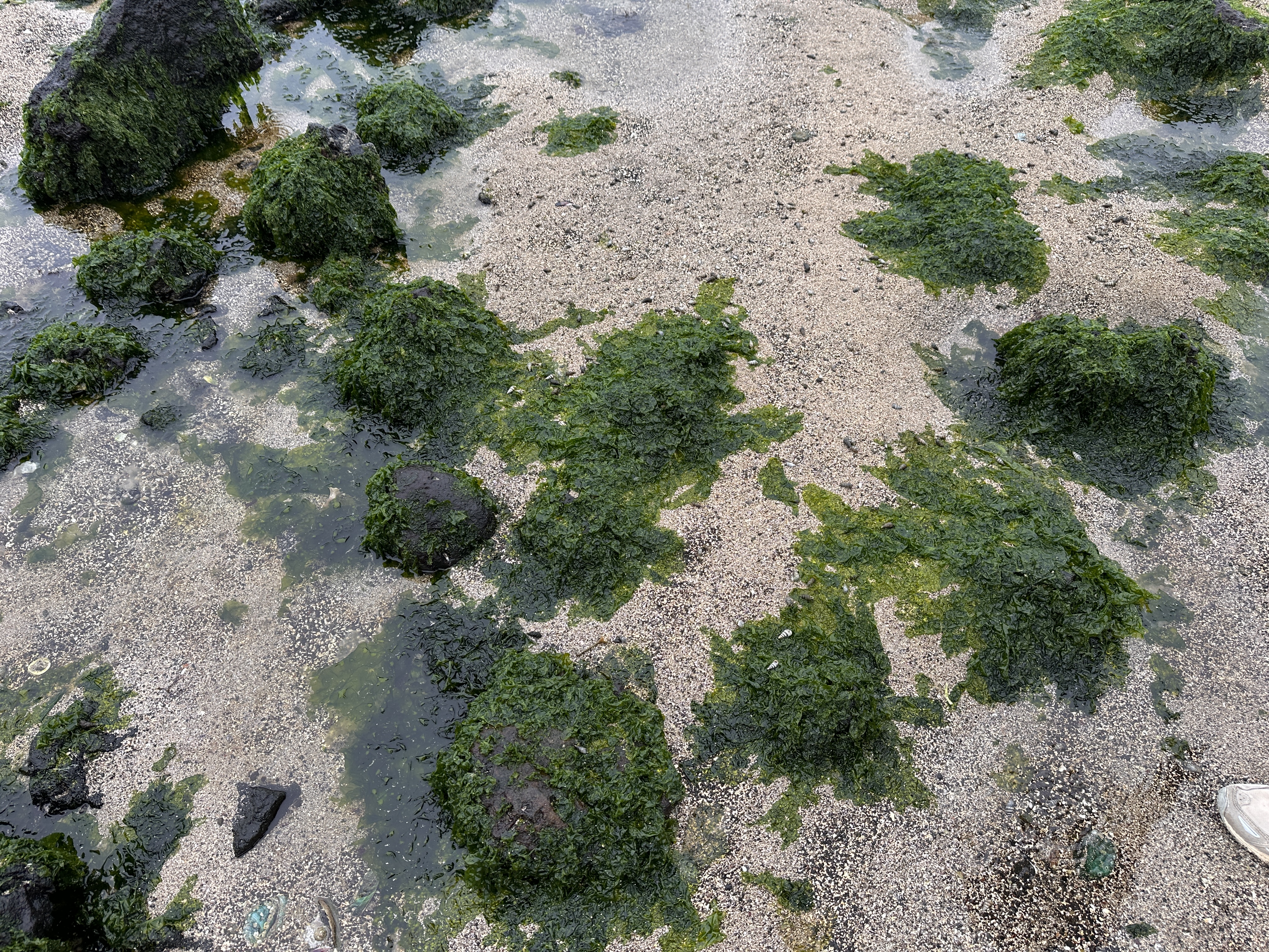 다음은 월정해수욕장이다. 구멍갈파래 없이 깨끗한 모습이었지만, 수면에 찰랑거리는 해조류를 보였다. 아직 밀려오기 전 떠다니는 파래들인가 싶었는데 정체는 바로 톳이었다! 올 봄에는 작년보다 수온이 낮아졌는데, 안보이던 해조류들이 다시 보이는 곳들이 있다고 쭈가 이야기해줬다. 좋은 일! 그리고 종달리의 모습처럼 적당한 양의 파래들로 볼 수 있었다.