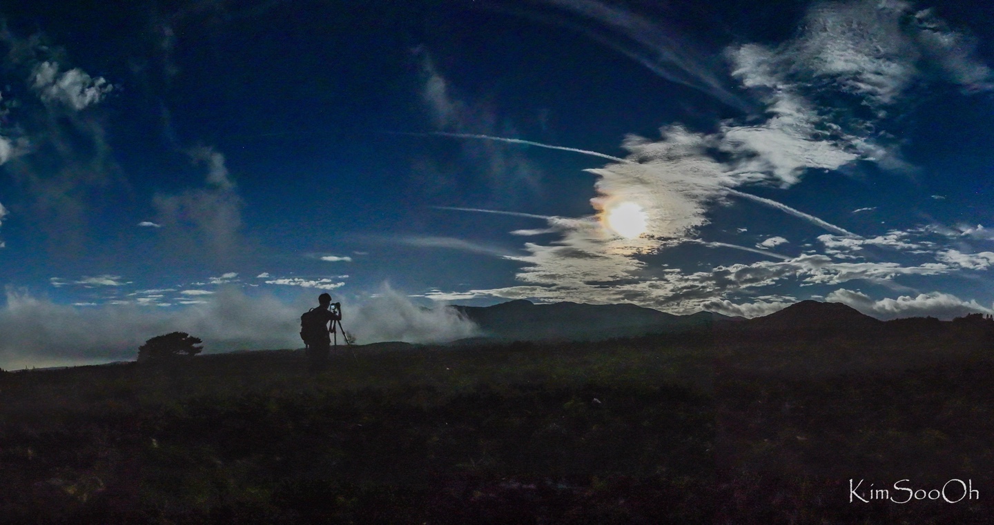 제주 중산간 들판에서 한라산 위로 떠오른 보름달을 담는 김수오 님 ⓒ김수오