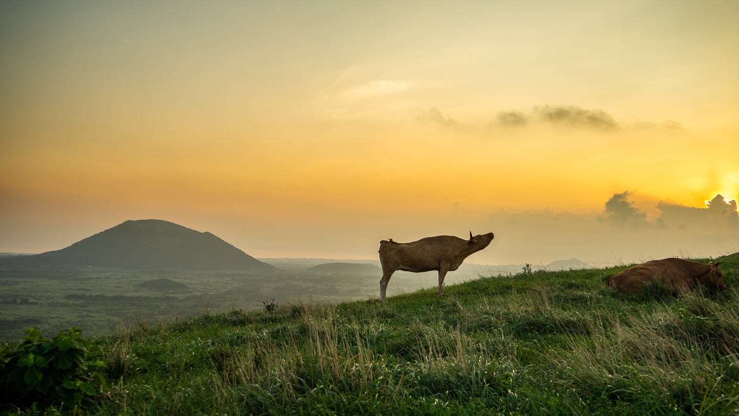동검은이 오름의 새벽 풍광. 봄부터 늦가을까지 오름 들판에 자유로이 방목된 소들 ⓒ김수오